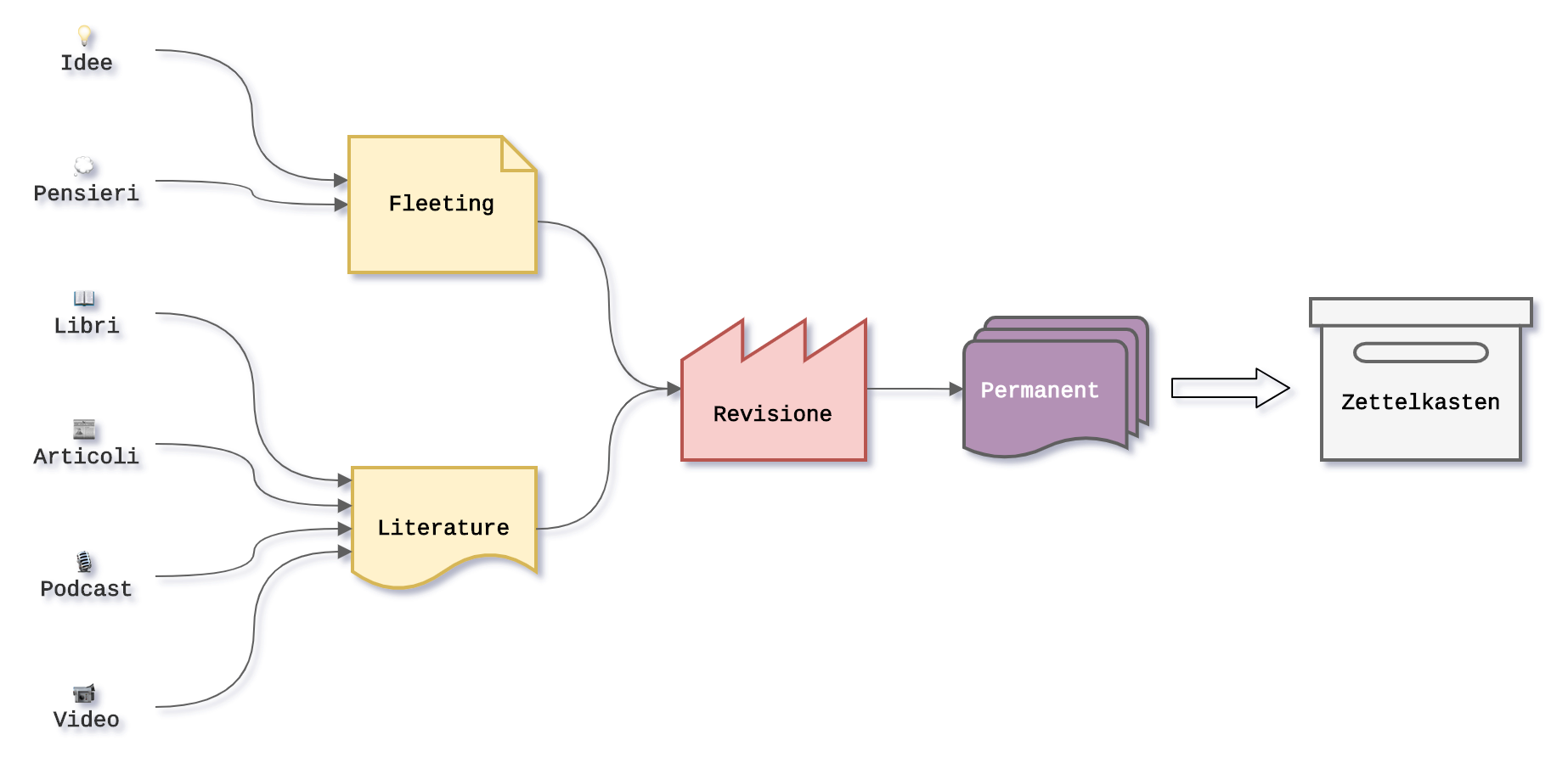 L’obiettivo del processo di revisione, schematizzato sopra, è di consolidare concetti e idee ognuno in una singola nota, che dovrebbe risultare atomica ⚛. Dovrebbe, cioè, trattare un unico concetto.
